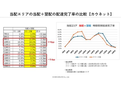 「当日選択式サービス」とは、当日配送エリアにおける前日18時から当日11時までのご注文について、通常のお届けを翌日とし、お客様のご希望に応じて当日配送を選択する仕組みです。(*1) 導入後の運用実績を調査した結果、これまで一律で当日配送していた物量の約36%が翌日配送へ移行しました。これにより配送網の過密が解消され、当日・翌日配送ともに配達完了時間の「前倒し」を実証しました。特に課題であった15時台から18時台の夕方の配送集中は9.4pp(パーセントポイント)緩和しており、物流現場の労働環境改善に繋がる成果が得られました。