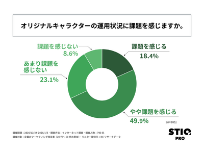 SHIP株式会社(本社:大阪府大阪市、代表取締役社長:岡本 渡)が運営する「STIQ PRO」は、企業のマーケティング担当者(20代~50代の男女)を対象に「企業のオリジナルキャラクターの活用に関する実態調査」を実施しました。この調査から、企業のマーケティング担当者の勤務先のオリジナルキャラクター活用目的や運用における課題などが明らかになりました。<調査背景>SNS発キャラクターが短期間で巨大IP化する現代において、企業キャラクターの企画・運用にはスピード感と拡散力が不可欠となっています。このようなSNS時代において、企業のキャラクター活用にはどのような課題意識が生まれているのでしょうか。多くの企業がキャラクター運用に試行錯誤し、効果的な活用方法やトレンドの変化への対応に課題を抱えている可能性があると考えられます。そこで、「STIQ PRO」は、企業のマーケティング担当者を対象に、「企業のオリジナルキャラクターの活用に関する実態調査」を実施しました。<調査サマリー>・企業のマーケティング担当者の約半数が、勤務先の企業は自社のオリジナルキャラクターを持っていると回答・オリジナルキャラクターを運用する主な目的は「親しみやすさ醸成」や「認知度向上」・オリジナルキャラクターの運用における主な活動は、「広告塔としての起用」や「デジタルコンテンツの配信」・自社のオリジナルキャラクターを持つ企業のマーケティング担当者の約7割が、オリジナルキャラクターの運用状況に課題を感じている・オリジナルキャラクターを運用する上で、最大の課題だと感じることは「認知度・エンゲージメント向上」・今後、オリジナルキャラクターを運用する上で最も強化したいことは「メディア連携・PR活動」<調査概要>調査期間:2025年12月24日~2026年1月5日調査方法:インターネット調査調査対象:企業のマーケティング担当者(20代~50代の男女)調査人数:790名モニター提供元:RCリサーチデータ企業のマーケティング担当者の約半数が、勤務先の企業は自社のオリジナルキャラクターを持っていると回答まず、「勤務先の企業は自社のオリジナルキャラクターを持っているか」を尋ねる設問への回答では、「はい」が48.7%、「いいえ」が51.3%という結果になりました。この結果から、企業のマーケティング担当者の約半数が、勤務先の企業は自社のオリジナルキャラクターを持っていると回答したことが明らかになりました。オリジナルキャラクターを運用する主な目的は「親しみやすさ醸成」や「認知度向上」次に、自社のオリジナルキャラクターを持つ企業のマーケティング担当者を対象に「オリジナルキャラクターを運用する主な目的は何か」を尋ねる設問への回答では、1位が「親しみやすさ醸成」で55.8%、2位が「認知度向上」で40.8%、3位が「商品・サービスの販促強化」で33.3%という結果になりました。この結果から、オリジナルキャラクターを運用する主な目的は、「親しみやすさ醸成」や「認知度向上」であることが判明しました。オリジナルキャラクターの運用における主な活動は、「広告塔としての起用」や「デジタルコンテンツの配信」続いて、自社のオリジナルキャラクターを持つ企業のマーケティング担当者を対象に「オリジナルキャラクターの運用において、具体的にどのような活動を行っているか」を尋ねる設問への個別の回答では、1位が「広告塔としての起用」で44.7%、2位が「デジタルコンテンツの配信」で30.9%、3位が「着ぐるみでのイベント出演」で27.0%という結果になりました。この結果から、オリジナルキャラクターの運用における主な活動は、「広告塔としての起用」や「デジタルコンテンツの配信」であることがわかりました。自社のオリジナルキャラクターを持つ企業のマーケティング担当者の約7割が、オリジナルキャラクターの運用状況に課題を感じているまた、自社のオリジナルキャラクターを持つ企業のマーケティング担当者を対象に「オリジナルキャラクターの運用状況に課題を感じるか」を尋ねる設問への回答では、1位が「やや課題を感じる」で49.9%、2位が「あまり課題を感じない」で23.1%、3位が「課題を感じる」で18.4%という結果になりました。1位と3位の回答を合計すると回答率68.3%となり、この結果から、自社のオリジナルキャラクターを持つ企業のマーケティング担当者の約7割が、オリジナルキャラクターの運用状況に、程度の差こそあれ、課題を感じていることが判明しました。オリジナルキャラクターを運用する上で、最大の課題だと感じることは「認知度・エンゲージメント向上」次に、オリジナルキャラクターの運用状況に課題を感じている企業のマーケティング担当者を対象に「オリジナルキャラクターを運用する上で、最大の課題だと感じることは何か」を尋ねる設問への回答では、1位が「認知度・エンゲージメント向上」で26.2%、2位が「キャラクターのブランディング」で23.2%、3位が「効果や費用対効果の可視化」で2