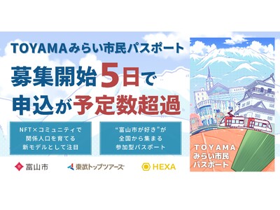 日本最大級のNFTマーケットプレイス「HEXA(ヘキサ)」を運営するメディアエクイティ株式会社は、東武トップツアーズ株式会社と連携し富山市の関係人口創出事業として提供している富山市公式「TOYAMAみらい市民パスポート」について、募集開始後まもなく多数の申込が集まり、2026年1月25日時点で発行予定数1,000枚を超える申込があったことをお知らせいたします。