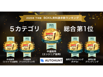 株式会社XAION DATA(本社:東京都千代田区、代表取締役:佐藤 泰秀)が提供する「AUTOHUNT」は、スマートキャンプ株式会社(以下「スマートキャンプ」)が主催する「2025年下半期 BOXIL資料請求数ランキング」の中途採用(エンジニア採用)部門など合計5カテゴリにて総合1位に選出されました。