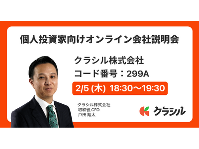 クラシル株式会社(以下、当社)は、2026年2月5日(木)にSBI証券主催の 「個人投資家向けオンライン会社説明会」 を開催いたします。オンラインにてライブ配信で実施し、当社取締役 CFO 戸田翔太(とだ・しょうた) が当社の事業内容、経営方針、成長戦略、および最新の決算・業績動向について詳しくご説明いたします。