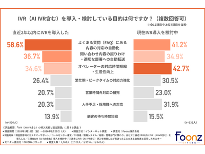 https://foonz.co.jp/)は、カスタマーサポート/コールセンター運営/DX推進/情報システム/総務・管理部門に関わり、自社で1.直近2年以内にIVR(AI IVR含む)を導入した/2.現在IVR(AI IVR含む)導入を検討中/3.過去にIVR(AI IVR含む)導入を検討したが見送ったことがある会社員を対象に、