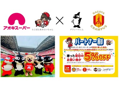 アオキスーパーは、昨シーズンに続き、名古屋グランパスのファンクラブ会員(ジュニア会員を除く)&アオキスーパーのポイントカード会員を対象に試合(リーグ戦)に勝利した翌日のお買い物が5%OFFになる『パートナー割』を実施いたします。