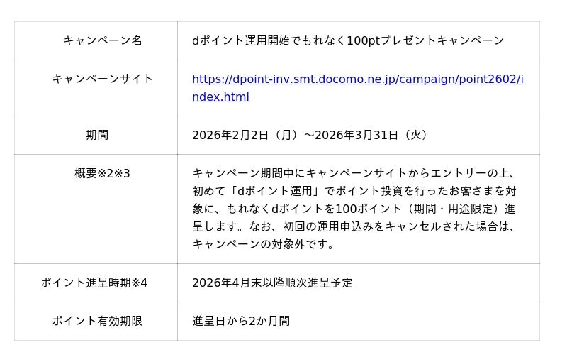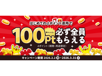 ※1」を初めてご利用のお客さまを対象に、「dポイント運用開始でもれなく100ptプレゼントキャンペーン」を、2026年2月2日(月)から2026年3月31日(火)まで開催します。