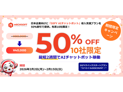 2026年2月2日から2月15日までの期間限定で、AIチャットボット構築を迅速に開始できる「Dify クイックスタート」プランを、通常価格80,000円のところ50%オフの40,000円にて提供します。先着10社限定となります。