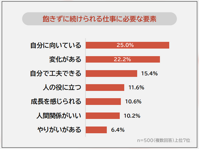 「飽きずに続けられる仕事に必要な要素は何だと思うか」を聞いたところ、最も多かった回答は「自分に向いている(25.0%)」でした。2位「変化がある(22.2%)」も20%以上で多くなっています。