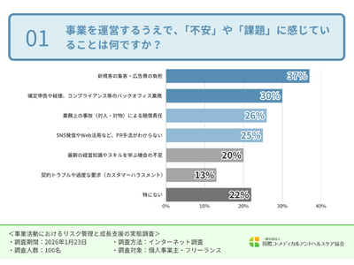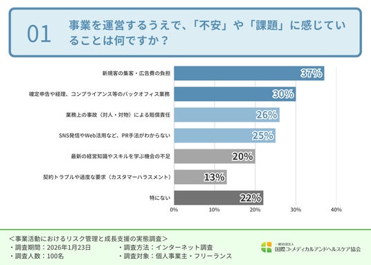 「新規客の集客・広告費の負担(37.0%)」「確定申告や経理、コンプライアンス等のバックオフィス業務(30.0%)」「業務上の事故による賠償責任(26.0%)」という結果が上位を占めました。