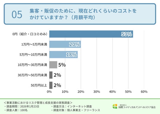 一方で、集客やPRにおいても、多くの個人事業主が広告費をかけられず、口コミや紹介に依存している現状が明らかになりました。