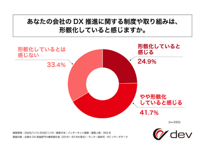株式会社dev(本社:長野県松本市、代表取締役:浅田 佑介)は、企業のDX推進部門の最終責任者(20代~50代の男女)を対象に「企業のDX推進における現場の意識に関する調査」を実施しました。この調査から、企業のDX推進部門の最終責任者が認識する自社のDX推進の進捗状況や課題、従業員の当事者意識の実態などが明らかになりました。