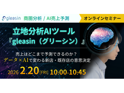 エムディー株式会社(本社:東京都港区、代表取締役社長:伊藤 弘人)は、最新のAIテクノロジーと精緻な顧客データを活用し、収益最大化の出店戦略を実現する、立地分析AIツール「gleasin(グリーシン)」のウェビナーを2026年2月20日に初開催いたします。
