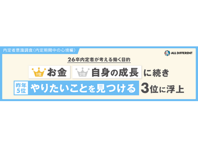 累計20,000社460万人以上の組織開発・人材育成を支援するALL DIFFERENT(オールディファレント)株式会社(所在地:東京都千代田区 代表取締役社長:眞崎大輔)および「人と組織の未来創り(R)」に関する調査・研究を行うラーニングイノベーション総合研究所(R)は、2025年9月25日~12月16日の期間で、2026年入社予定の内定者465人を対象に「内定者意識調査」を行いました。26卒内定者が内定先企業を決めた理由や内定期間に抱く気持ちについて調査・分析した結果を公表します。