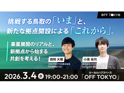 第3回は、鳥取で事業を始める・続けるリアルと、新拠点から生まれる共創にフォーカス。鳥取から世界に向けた事業を展開するONESTRUCTION株式会社の西岡大穂氏と、起業・スタートアップの支援事業に取り組む株式会社ツクリエの小泉祐司氏をゲストに迎えます。