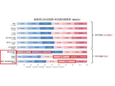 また、それぞれの症状において性別・年代別に回答率を見たところ、上位の症状には性年代間で大きな差がない一方で、下位の