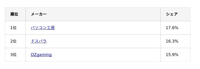 2026年1月は、パソコン工房が17.6%のシェアで前月に引き続き首位となりました。RTX5070Ti搭載モデルを中心にミドル~ハイエンド構成が注目されています。