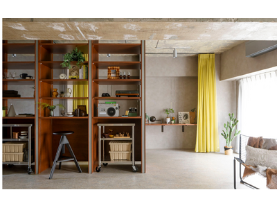 専有部では、空間をゆるやかに仕切る造作可動棚により、住まい手が趣味やこだわりにあわせてカスタマイズできる「余白」を確保しました。既存の天井材や壁紙の跡はあえて残し、建物の記憶と無骨な風合いを楽しめる内装デザインとなっております。エントランスには、コールテン鋼など経年変化を楽しめる素材を採用しています。