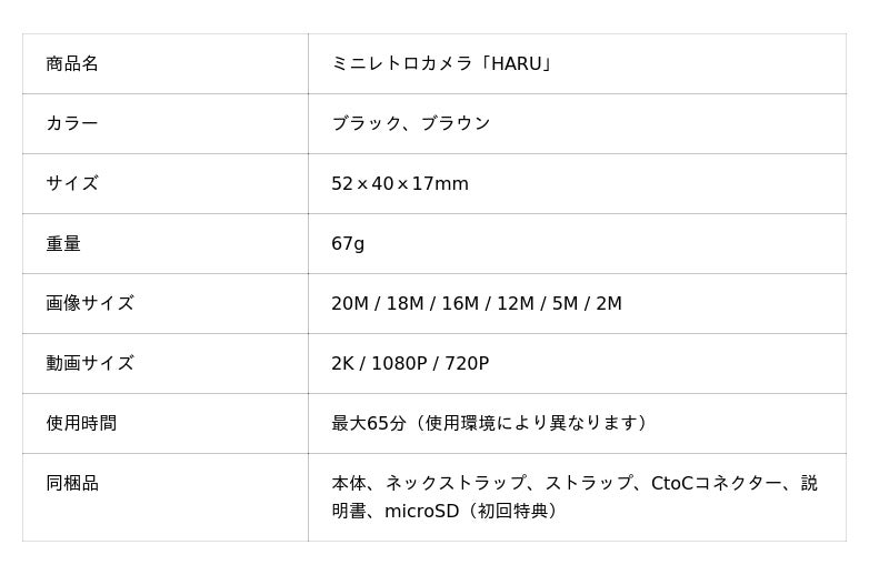 小さいカメラではキーチェーンで持ち運びするのがよくありますが、このミニレトロカメラ「HARU」は首掛け用のストラップも付属していて、本格的なカメラのように持ち運ぶことができます。