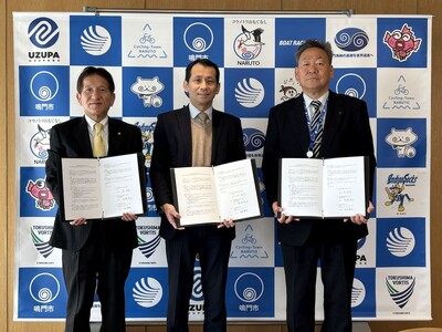 左から、泉理彦 鳴門市長、古屋輝周 KJホールディングス執行役員、阿部孝弘 鳴門市教育長