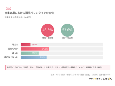 当事者層405名の回答を見ると、「以前より増えた」が11.9%、「以前と変わらない数を渡している」が34.6%となった。両者を合わせた「継続・増加層」は46.5%--半数近くに達する。リモートワークが普及した今も、職場バレンタインを維持・拡大している層が46.5%存在することが確認された。