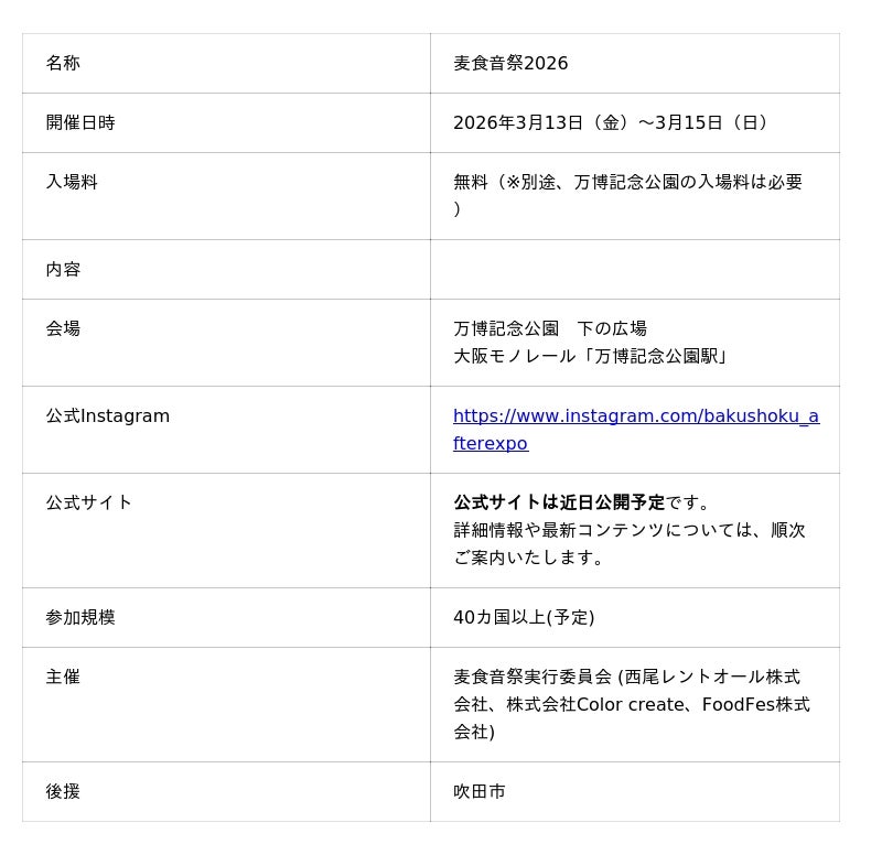 万博の閉幕を受け、その熱量とレガシーを次の時代へとつなぐ大型イベント「麦食音祭(ばくしょくおんさい)2026 ~ アフターEXPO ~」 を、2026年3月13日(金)~3月15日(日) の3日間にわたり