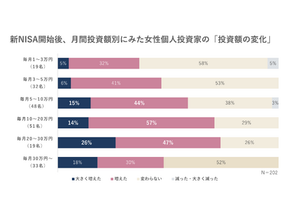 新NISA開始後、月間投資額別にみた女性個人投資家の「投資額の変化」(回答数:N=202)※月間投資額1万円以下は7名と人数が少ないためグラフでは省略