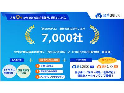 総合フィンテックソリューション企業であるSBI FinTech Solutions株式会社の子会社で、バックオフィス支援サービスを提供するSBIビジネス・ソリューションズ株式会社(本社:東京都港区、代表取締役社長:夏川 雅貴、以下「当社」)は、中小企業の法対応と業務効率化をサポートするクラウド型請求書管理システム「請求QUICK」において、継続利用のお申し込み社数が7,000社を突破しましたので、お知らせいたします。