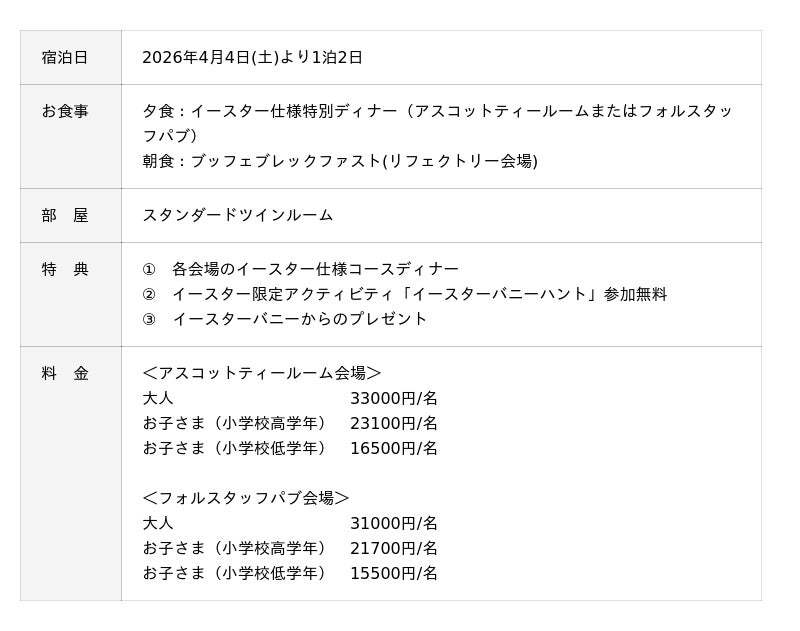 海外のイースター文化を体験できる特別宿泊プラン「ハッピーイースタープラン」を提供いたします。本プランでは、イースター仕様のコースディナーやイースターバニーからのプレゼントなど、多彩な特典をご用意しております。