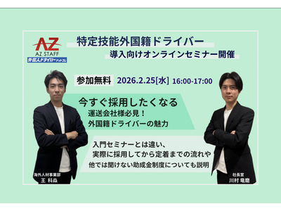 「外国人ドライバードットコム」は、2026年2月25日16:00~17:00に、物流業界における「ドライバー不足」問題の解消に向けた特定技能制度を利用した「外国籍トラックドライバー導入向けオンラインセミナー」を開催することが決定しました。