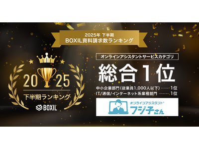 オンラインアシスタント(R)「フジ子さん」は、「2025年下半期 BOXIL資料請求数ランキング」において、オンラインアシスタントサービス総合ランキング第1位を獲得しました。なお、中小企業向け部門およびIT/通信/インターネット系業種部門でも第1位に選出されています。