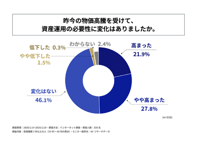 ティーガッツケイ株式会社(本社:大阪府大阪市、代表取締役:神行 孝至)は、投資経験3年以上の人(30代~60代の男女)を対象に「物価高騰下における資産運用に関する調査」を実施しました。この調査から、投資経験3年以上の人の物価高騰下における資産運用への意識や悩み、投資方針の実態などが明らかになりました。<背景>長引く物価高騰は、家計への負担のみならず、個人の資産運用環境にも大きな変化をもたらしています。現金のままでは資産の実質価値が目減りしてしまうリスクが高まる中、投資経験者であっても、従来の運用戦略の見直しが必要不可欠となっています。そこで、ティーガッツケイ株式会社は、投資経験3年以上の30代~60代の男女を対象に、物価高騰下において個人の資産運用に対する意識や行動がどのように変化したのか、その実態を明らかにする調査を実施しました。<調査サマリー>・投資経験3年以上の人の約半数が、昨今の物価高騰を受けて資産運用の必要性が高まったと感じている・昨今の物価高騰を受けて生じている資産運用に関する主な悩みは、「相場変動が激しくリスク管理が難しいこと」や「投資に回す資金が減っていること」・投資経験3年以上の人の約4割が、物価高騰で生活費が増える中での投資資金の捻出方法として「以前から確保していた余剰資金を使用している」・投資経験3年以上の人の8割以上が、昨今の物価高騰を受けても資産運用の方針を変更していない・昨今の物価高騰を受けて資産運用の方針を変更した投資経験3年以上の人の最も多くが「リスクを抑え、資産を守ることを追求する」方向へ資産運用の方針を変更している・投資経験3年以上の人が現在注目している主な投資先は、「国内株式」や「投資信託」<調査概要>調査期間:2026年1月14日~1月19日調査方法:インターネット調査調査対象:投資経験3年以上の人(30代~60代の男女)調査人数:338名モニター提供元:RCリサーチデータ投資経験3年以上の人の約半数が、昨今の物価高騰を受けて資産運用の必要性が高まったと感じているまず、「昨今の物価高騰を受けて、資産運用の必要性に変化はあったか」を尋ねる設問への回答では、1位が「変化はない」で46.1%、2位が「やや高まった」で27.8%、3位が「高まった」で21.9%という結果になりました。「変化はない」という回答が最も多かったものの、2位と3位の回答を合計すると回答率49.7%となり、この結果から、投資経験3年以上の人の約半数が、昨今の物価高騰を受けて資産運用の必要性が、程度の差こそあれ、高まったと感じていることが判明しました。昨今の物価高騰を受けて生じている資産運用に関する主な悩みは、「相場変動が激しくリスク管理が難しいこと」や「投資に回す資金が減っていること」続いて、「昨今の物価高騰を受けて、資産運用に関してどのような悩みが生じているか」を尋ねる設問への回答では、1位が「特に悩みはない」で34.6%、2位が「相場変動が激しく、リスク管理が難しい」で26.3%、3位が「投資に回す資金が減っている」で15.4%という結果になりました。この結果から、「特に悩みはない」という回答が最も多かったものの、昨今の物価高騰を受けて生じている資産運用に関する主な悩みは、「相場変動が激しくリスク管理が難しいこと」や「投資に回す資金が減っていること」であることがわかりました。投資経験3年以上の人の約4割が、物価高騰で生活費が増える中での投資資金の捻出方法として「以前から確保していた余剰資金を使用している」次に、「昨今の物価高騰で生活費が増える中、投資資金はどのように捻出しているか」を尋ねる設問への回答では、1位が「以前から確保していた余剰資金を使っている」で41.7%、2位が「投資資金は増やしていない」で29.9%、3位が「副業やポイ活などの副収入を充てている」で23.4%という結果になりました。この結果から、投資経験3年以上の人の約4割が、物価高騰で生活費が増える中での投資資金の捻出方法として「以前から確保していた余剰資金を使用している」ことが明らかになりました。投資経験3年以上の人の8割以上が、昨今の物価高騰を受けても資産運用の方針を変更していないまた、「昨今の物価高騰を受けて、資産運用の方針を変更したか」を尋ねる設問への回答では、「いいえ」が83.4%、「はい」が16.6%という結果になりました。この結果から、投資経験3年以上の人の8割以上が、昨今の物価高騰を受けても資産運用の方針を変更していないことが判明しました。昨今の物価高騰を受けて資産運用の方針を変更した投資経験3年以上の人の最も多くが「リスクを抑え、資産を守ることを追求する」方向へ資産運用の方針を変更している続いて、昨今の物価高騰を受けて資産運用の方針を変更した投資経験3年以上の人を対象に「昨今の物価高騰を受けて、資産運用の方針をどのように変更したか」を尋ねる設問への回答では、1位が「リスクを抑え、資産を守ることを追求する」で42.9%、2位が「運用額
