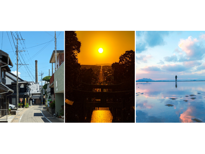 (左)津屋崎千軒・(中央)宮地嶽神社 光の道・(右)かがみの海