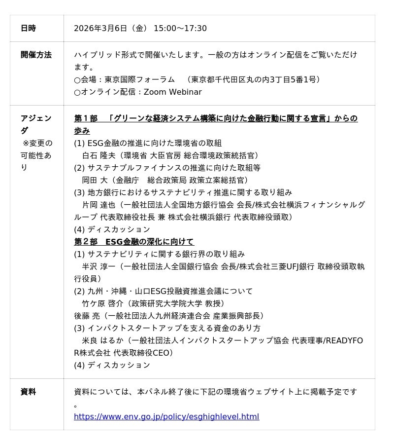 今回、我が国におけるESG金融の更なる主流化に向けて、金融・投資分野等の関係業界トップが一堂に会するESG金融ハイレベル・パネル(第9回)を下記のとおり開催します。
