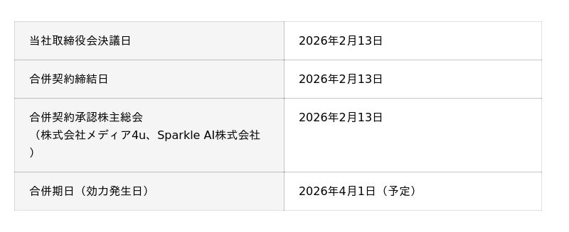 株式会社メディア4uを存続会社、Sparkle AI株式会社を消滅会社とする吸収合併方式です。