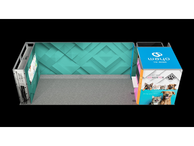 【風洛 FU-RAKU】は、折りたたみ式LEDビジョン【風帆 FU-HAN】同様、モジュール連結式の大型LEDビジョンをフレームに組み込める基本設計を採用しています。トラス工事不要/短時間設営/モニターを横に連結し、継ぎ目のない大画面演出が出来ます。アルミキューブとファブリックス製クロスによる面の演出と、大型LEDビジョンによる映像訴求を同時に実装することで、来場者の視線を引きつける迫力ある空間表現を実現します。