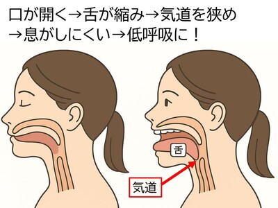 1.あごが下がり、口が開く→2.舌先が上あごから離れる →舌根が太くなり気道を狭め、息をしにくくする→3.気道内圧低下し、舌が喉奥へ落ち込み、気道を塞ぐ(舌根沈下、SAS)。