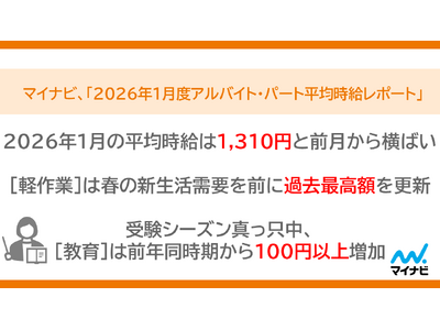 株式会社マイナビ(本社:東京都千代田区、代表取締役 社長執行役員:粟井俊介)は、「2026年1月度アルバイト平均時給レポート」を発表しました。本調査は、アルバイト・パート求人情報サイト『マイナビバイト』(