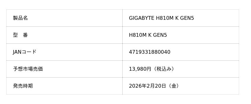株式会社ニューエックス(本社:東京都千代田区)は、取り扱いメーカーであるGIGABYTEより、Intel H810チップセットを搭載した上 Micro-ATX マザーボードの「GIGABYTE B810M K GEN」を2026年2月20日(金)に発売いたします。