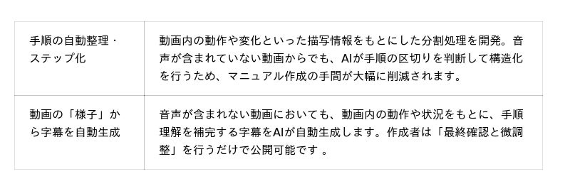 こうした課題に対し、動画内の動きや描写をもとにした動画分割機能を開発することで、音声の有無に左右されず動画資産を活用できる環境を実現。作成における実務的・心理的ハードルを根本から下げ、現場の誰もがマニュアルを作成・更新できる環境づくりを支援します 。