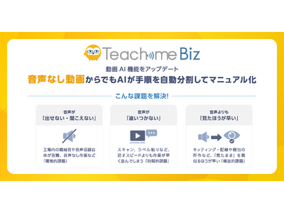 リーンオペレーションの実現を支援する株式会社スタディスト(本社:東京都千代田区、代表取締役CEO:鈴木悟史、以下「スタディスト」)は、マニュアル作成・共有システム「Teachme Biz(ティーチミー・ビズ)」において、音声のない動画からでもAIが動きや変化といった描写情報をもとに手順を判別してシーン分割し、マニュアルのドラフトを生成できる新機能をリリースすることをお知らせします。今回のアップデートにより、現場の作業動画や無音の画面収録はもちろん、「話すスピードよりも作業が早い工程」や「見たままを真似るほうが早い所作」など、音声による解説が困難、あるいは適さない動画からでも、AIが手順の区切りを判別してマニュアルの土台をスムーズに作成できるようになります。