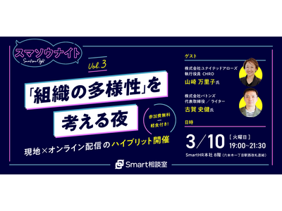 働く人のモヤモヤに向き合い、個人の成長と組織の成長の一致を支援する株式会社Smart相談室(本社:東京都港区、代表取締役・CEO:藤田 康男)は、2026年3月10日(火)19時より「スマソウナイトvol.3 ~「組織の多様性」を考える夜~」を開催いたします。本イベントはオフライン・オンラインのハイブリッド開催です。