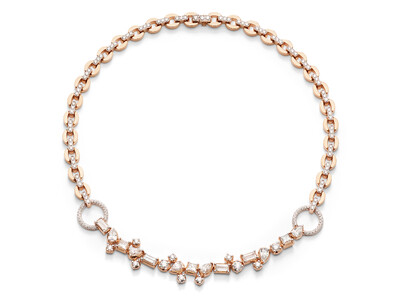 その独自の対話は、洗練されたコントラストの妙によって表現されます。有機的で流れるようなチェーンのフォルムと、ファンシーカットダイヤモンドの建築的な精緻さが織りなす緊張感を探求します。ローズゴールドのやわらかな輝きと、ペアシェイプ、プリンセス、バゲットカットのシャープな煌めきが出会い、常識にとらわれない美しさが生まれます。アシンメトリーなデザインが奏でるリズムは、控えめでありながら予想外、そして飾らない優雅さを宿し、ミラノらしさを体現しています。