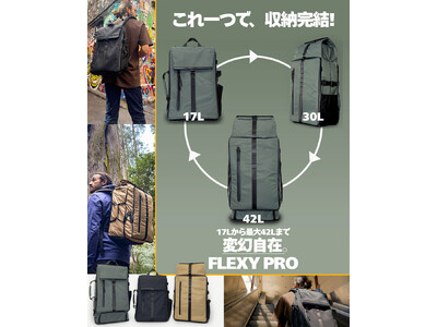 話題を集めた、一つのバッグで日常使いの少量荷物からスーツケース並みの大容量ま で収納できる 【FLEXY】が、PROモデルとして大幅グレードアップして登場!