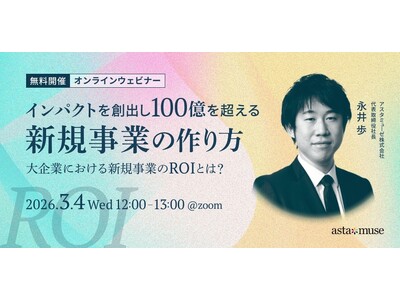 アスタミューゼ株式会社(本社:東京都千代田区、代表取締役社長 永井歩)は、2026年3月4日(水)12:00-13:00に、新規事業担当者、経営企画担当者向けの無料ウェビナー「インパクトを創出し100億を超える新規事業の作り方 ~大企業における新規事業のROIとは?~」を開催いたします。