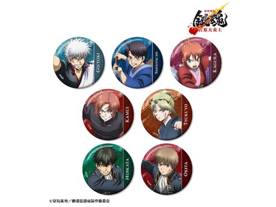 坂田銀時、志村新八、神楽、神威、月詠、土方十四郎、沖田総悟の描き下ろしイラストをグリッター加工を施した缶バッジに仕上げました。