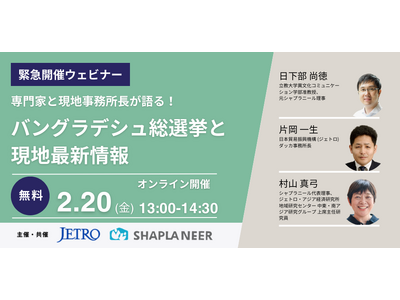 認定NPO法人シャプラニール=市民による海外協力の会(東京都新宿区、代表理事:村山真弓)は、日本貿易振興機構(ジェトロ)との主催・共催にて、2026年2月20日(金) 13:00より、無料ウェビナー「専門家と現地所長が語る!バングラデシュ総選挙と現地最新情報」を緊急開催いたします。