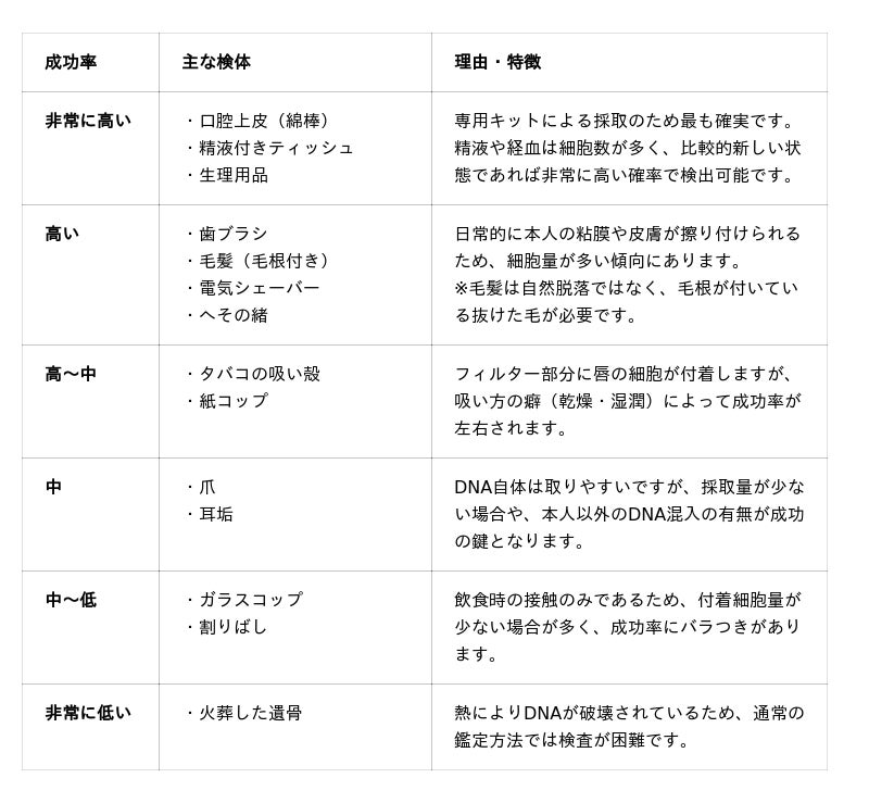 DNA鑑定に使える検体の種類と検査成功率