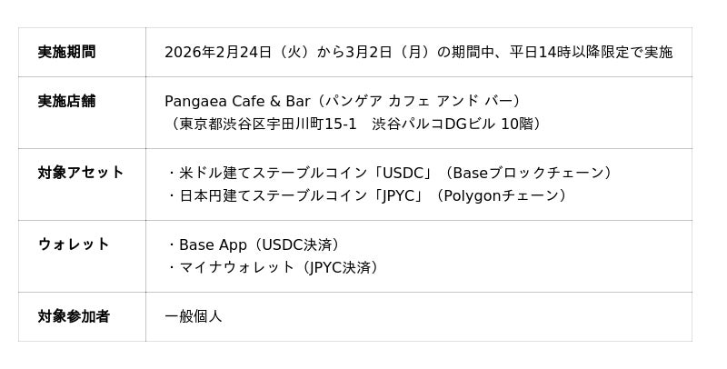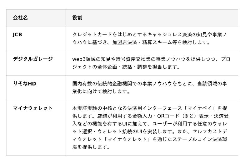 株式会社ジェーシービー (本社: 東京都港区、代表取締役会長兼執行役員社長: 二重 孝好、以下: JCB)、株式会社デジタルガレージ(東証プライム 4819、本社:東京都渋谷区、代表取締役 兼 社長執行役員グループCEO: 林 郁、以下: デジタルガレージ)、株式会社りそなホールディングス(東証プライム: 8308、本社: 東京都江東区、取締役兼代表執行役社長兼グループCEO: 南 昌宏、以下: りそなHD)は、マイナウォレット株式会社(本社: 東京都千代田区、代表取締役: 橘 博之、以下: マイナウォレット)とともに、2026年2月24日(火)から3月2日(月)の期間にて、「USDC(米ドル建てステーブルコイン)」および「JPYC(日本円建てステーブルコイン)」を活用した、実店舗におけるステーブルコイン決済の実証実験を実施します。