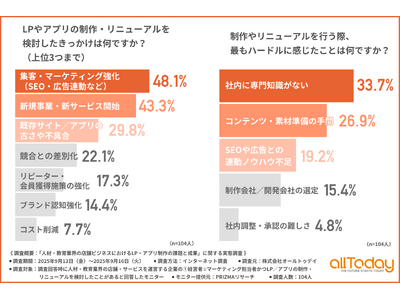Web集客や新規事業への意欲が高い一方、社内ノウハウの欠如が浮き彫りに株式会社オールトゥデイ(本社所在地:埼玉県さいたま市)は、人材・教育業界の店舗・サービスを運営する企業の1.経営者2.マーケティング担当者かつLP/アプリの制作・リニューアルを検討したことがある方を対象に、「人材・教育業界の店舗ビジネスにおけるLP・アプリ制作の課題と成果」に関する実態調査を実施しましたので、その結果を公表します。調査概要調査概要:「人材・教育業界の店舗ビジネスにおけるLP・アプリ制作の課題と成果」に関する実態調査【調査期間】2025年9月12日(金)~2025年9月16日(火)【調査方法】PRIZMA(https://www.prizma-link.com/press)によるインターネット調査【調査人数】104人【調査対象】調査回答時に人材・教育業界の店舗・サービスを運営する企業の1.経営者2.マーケティング担当者かつLP/アプリの制作・リニューアルを検討したことがあると回答したモニター【調査元】株式会社オールトゥデイ(https://www.alltoday.jp/)【モニター提供元】PRIZMAリサーチ※本アンケート結果を引用する場合は「株式会社オールトゥデイ」のURL(https://www.alltoday.jp/)を使用してください。調査結果サマリー「LPやアプリの制作・リニューアルを検討したきっかけ」について尋ねたところ、『集客・マーケティング強化(SEO・広告連動など)(48.1%)』と回答した方が最も多く、『新規事業・新サービス開始(43.3%)』『既存サイト/アプリの古さや不具合(29.8%)』となりました。約半数が『集客・マーケティング強化(SEO・広告連動など)』を理由に挙げており、Web施策が事業成長の要と捉えられていることがうかがえます。また、『新規事業・新サービス開始』も4割を超えていることから、既存事業の改善だけでなく、新たな収益源の確保に向けた積極的な投資意欲も見て取れます。多くの企業がWeb施策の強化に前向きな姿勢を示していますが、実際の制作進行においてはどのような課題が障壁となっているのでしょうか。「制作やリニューアルを行う際、最もハードルに感じたこと」について尋ねたところ、『社内に専門知識がない(33.7%)』と回答した方が最も多く、『コンテンツ・素材準備の手間(26.9%)』『SEOや広告との連動ノウハウ不足(19.2%)』となりました。『社内に専門知識がない』が最多となり、多くの企業でデジタル領域に精通した人材が不足している現状が浮き彫りになりました。『SEOや広告との連動ノウハウ不足』も約2割に上ることから、単に作るだけでなく、作った後の運用や集客効果への不安も大きいと推察されます。また、『コンテンツ・素材準備の手間』も上位に入になり、通常業務と並行してWeb制作を進めることの負担感が示されました。では、それらの課題に対応するためにどのような制作体制を予定しているのでしょうか。「LP/アプリ制作は外注・内製どちらを選ぶ予定か」と尋ねたところ、以下のような回答結果になりました。『完全外注(40.4%)』『部分外注(51.0%)』『完全内製(8.6%)』『完全外注』『部分外注』を合わせると約9割の企業が外部パートナーの活用を前提としており、完全内製を行う企業は1割未満にとどまりました。これは、前の質問で明らかになった「社内の専門知識不足」という課題と強く相関していると考えられます。特に、『部分外注』が過半数を占める結果からは、コストを抑えつつ自社で対応できない専門領域のみをプロに任せたいという、効率的なリソース配分への意向がうかがえます。【まとめ】今回の調査で、人材・教育業界の店舗運営において、「集客」や「新規事業展開」を目的としたLP/アプリ制作への意欲が高いことが確認できました。しかし、社内に専門知識を持つ人材が不足していることや、コンテンツ準備の手間、SEOや広告との連動ノウハウ不足などがハードルとなっており、理想とするWeb戦略を自社のみで完結させることの難しさも浮き彫りになっています。こうした背景から、約9割の企業が制作において「外注」を検討しており、特に自社のリソースと外部の専門性を組み合わせる「部分外注」への需要が高い傾向が見られました。今後のWeb戦略においては、単に制作を依頼するだけでなく、不足しているノウハウを補い、運用面まで含めた伴走支援が可能なパートナー選びが成功の鍵になると考えられます。株式会社オールトゥデイ株式会社オールトゥデイ(https://www.alltoday.jp/)は、携帯端末を利用した効果的なプロモーションを実現する総合ソリューションサービスをご提供しております。顧客管理やアフターフォロー、クチコミで来店のきっかけづくりをお手伝いします。お店にご来店いただいたお客様に、携帯電話にて会員登録をしていただき、ポイント会員やケータイクーポン、予約受付、メッセージ配信など多様な機能により再来店を促す事ができ、効果的にお客様をリピーターに育てることができます。独自の情報発信やケータイクーポンの発行、ケータイ会員の一元管理、顧客の来店頻度や属