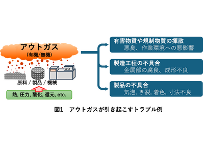 製品の開発、製造、輸送、保管、使用、廃棄の各工程において材料や製品からアウトガス(揮発成分)が発生することがあります。アウトガスには反応生成ガスや分解ガス、残存溶媒の蒸発、燃焼生成ガスなどが含まれ、異臭、規制物質の揮散などの作業環境への悪影響、金型や金属部品の腐食や付着物による成形不良などのトラブルを引き起こすことがあります(図1)。例えば、リサイクルPP(ポリプロピレン)の異臭では、製造工程でのアウトガスや、保管時の劣化、包装材からの臭い移りなどに加えて、市場回収品に由来する異臭成分の混入など、トラブル要因は多岐に渡ります。