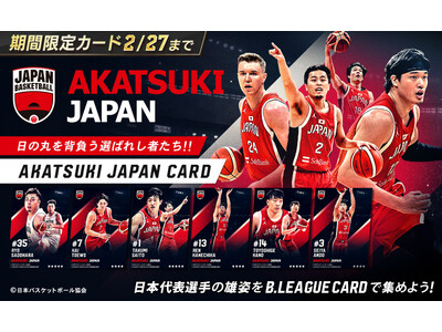 バスケットボール男子日本代表チームが新体制になり、重要な初戦が、いよいよ2月26日(木)より開催されます。 日本代表選手たちの雄姿をファンの皆様へ届けるべく、「B.LEAGUE CARD」にて新シリーズ「AKATSUKI JAPAN」をリリースいたします。本シリーズは、対象カードが1枚確定で獲得できる、限定販売の「10連カードパック」にて登場いたします。
