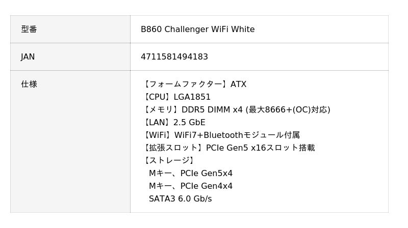 B860 Challenger WiFi White | ASRock(アスロック) LGA1851 Intel B860 ATX WiFi+Bluetoothモジュール付属 ホワイトカラー マザーボード